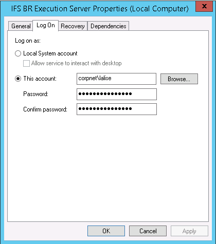 Figure 2: Defining the account for the system service representing IFS Business Reporter Execution Server