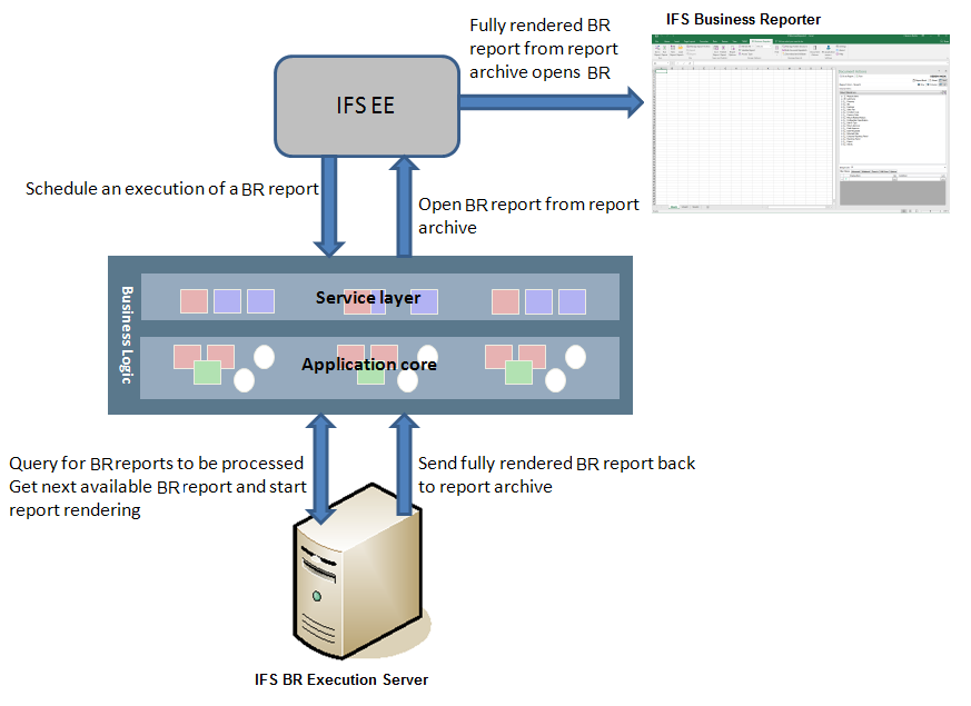 IFS Business Reporter Execution Server is an application/service running on a Microsoft OS. The main task is to enhance batch processing of IFS Business Reporter reports by uploading the report template, the MS Excel book, as well as the result set and then put it all together to a 100% ready MS Excel report. This means that that when the batch processing is done, the end user can open up the report from the report archive in IFS Applications and get it quickly loaded in MS Excel without having to wait for any processing.