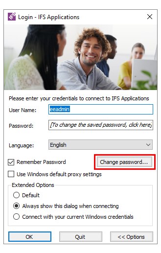 You can change the password in two ways. The first is by using the Change Password button in the Login dialog.