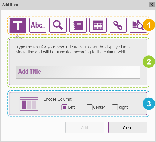Type in the text for your new Title element. The content will display in a single line and truncate according to the column width of your page. | |