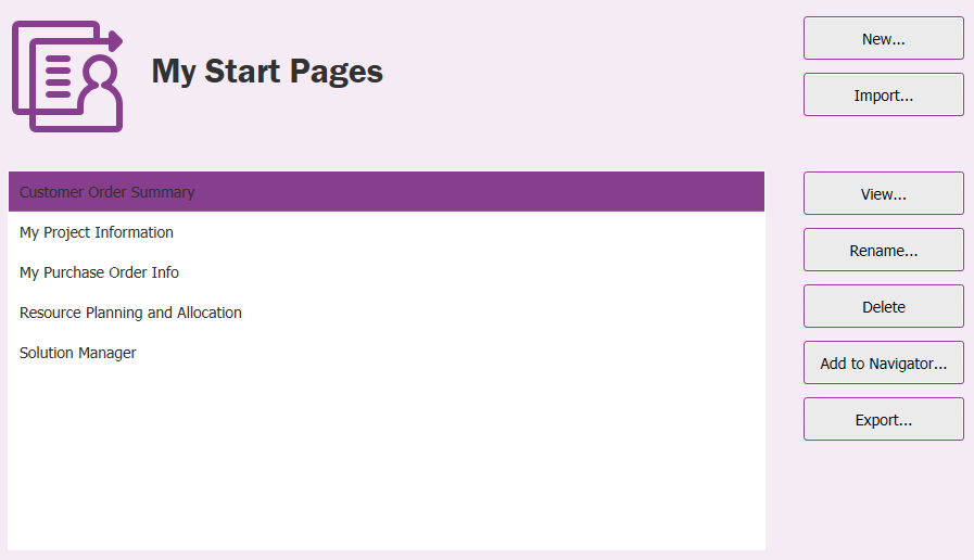 My Start Pages is the overview page where you can manage all your My Start Pages. The page consists of a list of all your My Start Pages and a set of buttons to perform various operations.