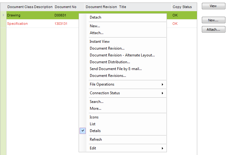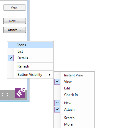 By default the View, New and Attach buttons are available on the right hand side. It's possible to configure other buttons to be visible via the Context Menu. The following are available: Instant View, View, Edit, Check In, New, Attach, Search and More