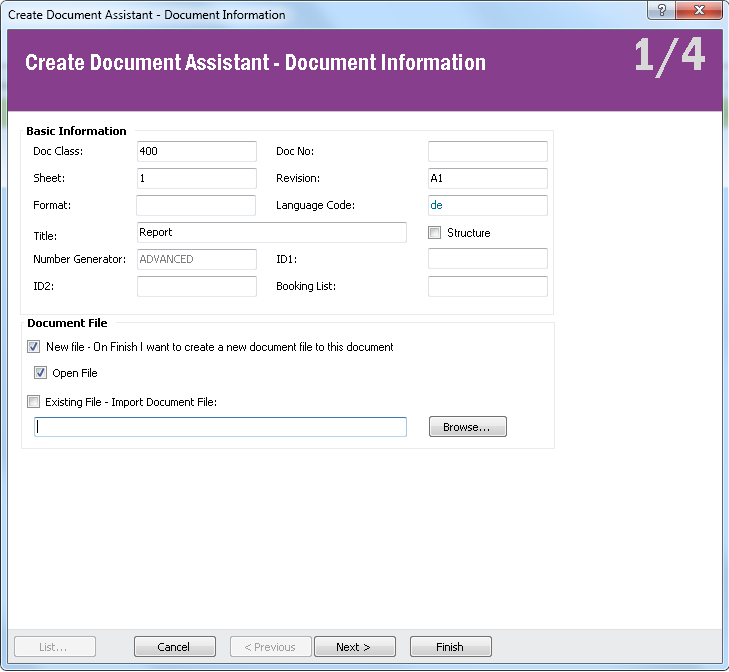 In these dialogs you enter document class, document title and then you can either type the file path or use the Browse button to open your file browser to select a file from your computer/network to connect the document.