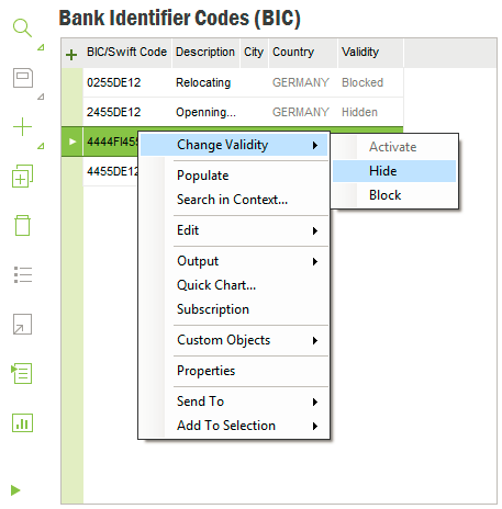 Note: Once you change the validity of records, they would be available in the forms where the records are shown. But note that if you change records from Blocked to Active or Hidden, an application restart is required for the changes to take effect.