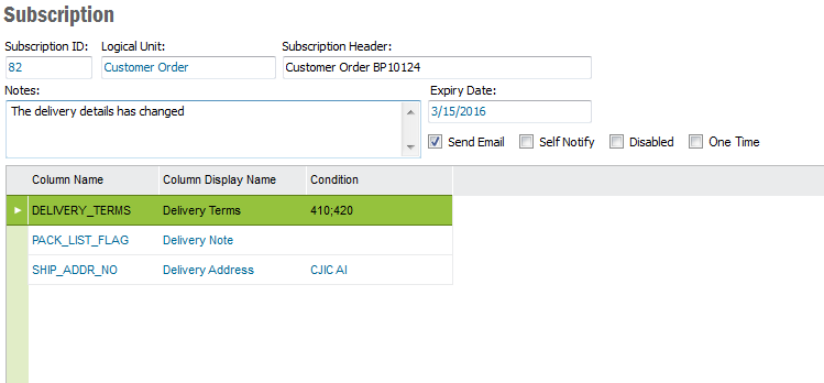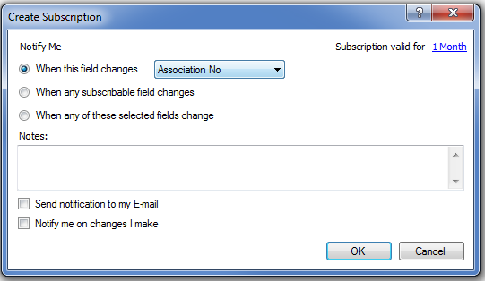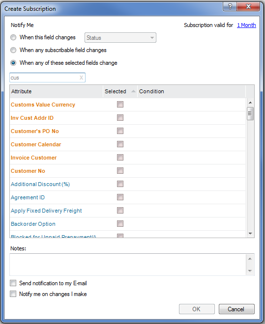 To be able to get notifications for the subscribed object you can optionally give conditions that must be fulfilled for each subscribed field. The notification is thus only sent if the conditions are met. You can follow the same formulas you use in the Search Dialog and Conditional Formatting Dialog to set conditions for the subscribed fields.