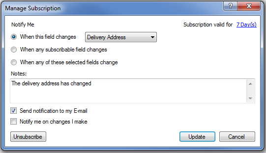 You may add a note to the subscription which is displayed in the notification sent to you once the change has happened. This can be used as a reminder on any necessary actions or other important information that is connected to the change.