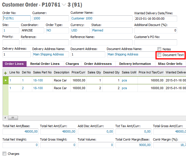 Many objects in IFS Applications supports usage of Document Text. Document Texts are printed on the documents related to the object it's connected to. Some objects support Document Texts on header and rows and some on the header only or rows only.