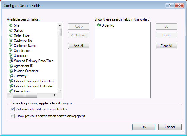 The dialog consists of two parts: On the left hand side there is a list of all available search fields and on the right hand side there is a list of the fields you have selected to display. You highlight a field on the left hand side and click Add button to add it to the list. You may change the order the fields are presented in via the Up and Down buttons.
