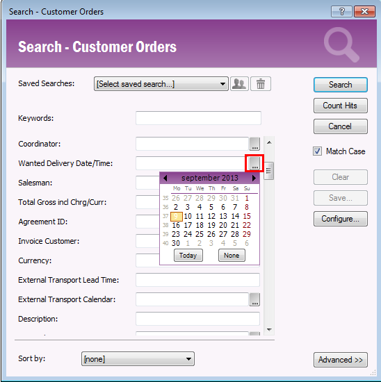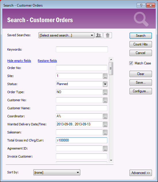 Figure 7. Example of a combination of search fields. This will search for orders on site 1 where status is "Planned", order type is "NO", coordinator starts with A, wanted delivery date is between 2013-09-09 and 2013-09-13 and the Total Gross Amount is larger than 100000.