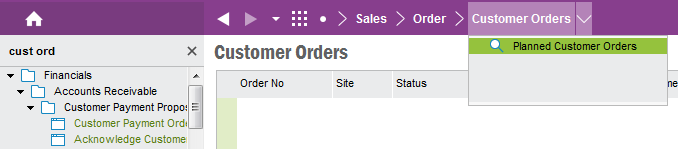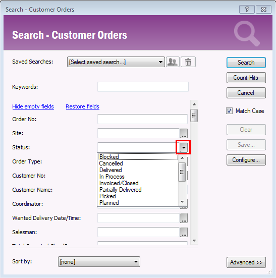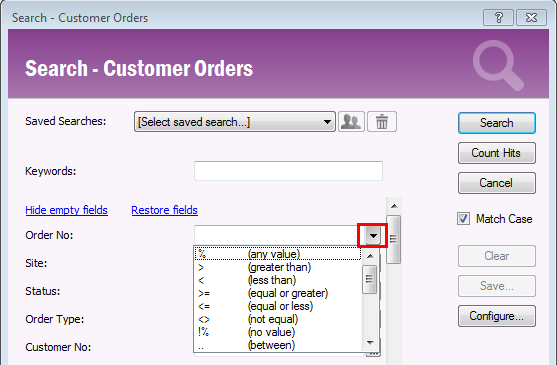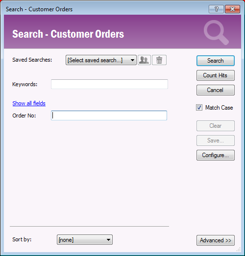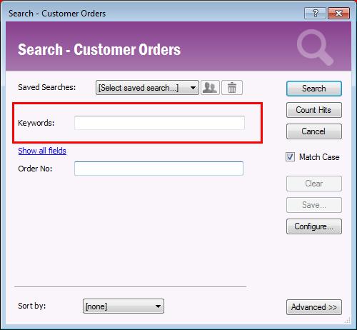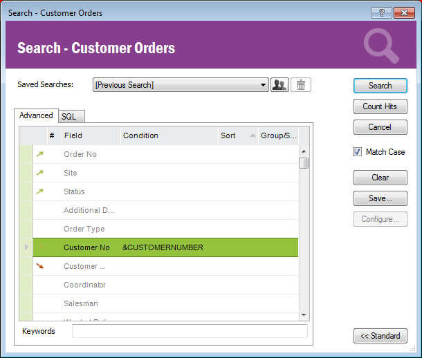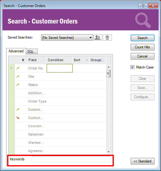 Example: In pages related to customer orders you may search for keywords such as Order No, Customer No, Customer Name, Customer PO No. etc. without having to use the specific search fields in the search dialog.