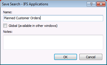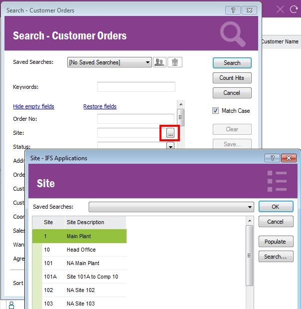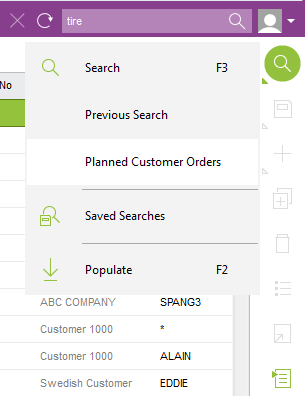 Open an IFS Application page and open the search dialog via F3 or via the Search button in the page toolbar. If you are working in a master detail page like e.g. the Customer Order page which contains an order header and order lines, this will open the search dialog for the header. To open the search dialog for the lines/details click Shift+F3 or select Search in Context via the Context menu.
