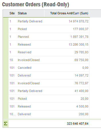 Figure 12. Example of result of group and sum conditions used in Figure 11. Customer orders are grouped by Site and Status and Total Gross Amt is summarized