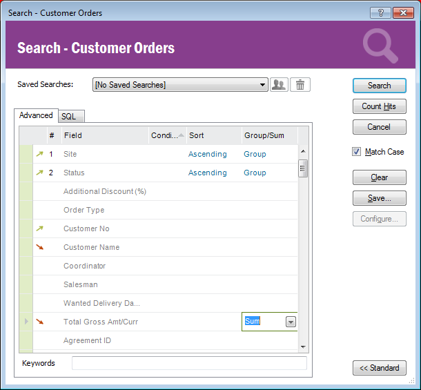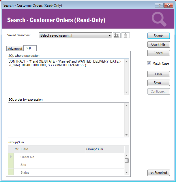 click Advanced button and open the SQL tab. The conditions entered in the normal search are then transferred to the advanced query.