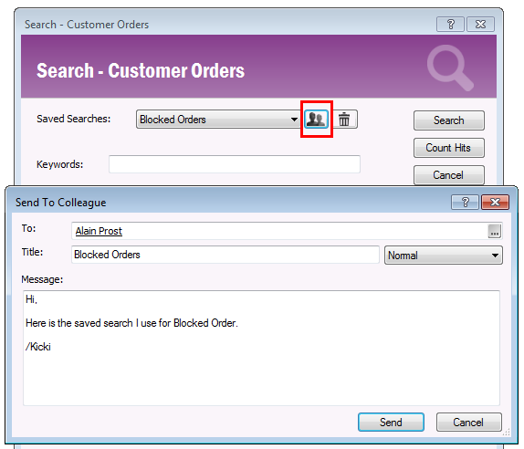 Figure 19. Share Saved Search button and Send to Colleague dialog