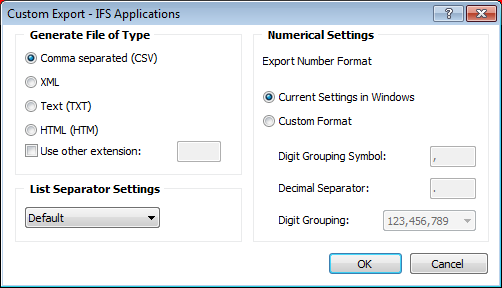 Highlight information in an IFS Applications page, open the Output panel and click Custom Export button, the Custom Export dialog is displayed.