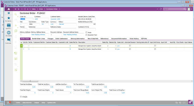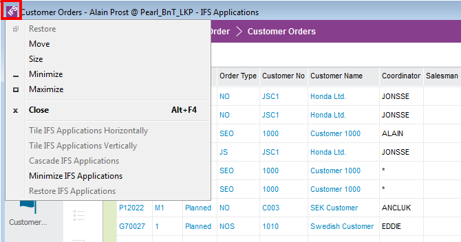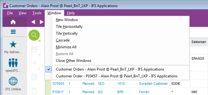 To arrange windows, use the options found under the Windows in main menu, or the options under the system menu of IFS Enterprise Explorer.