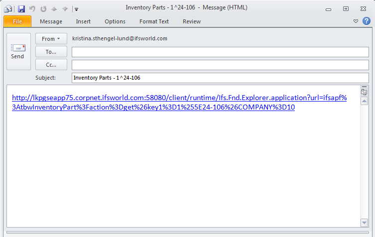 Mail Recipient as Link will open your default email application. There will be a link in the email which links to the object(s) you have selected. When the receiver clicks on the link it will open IFS Applications and the page with the objects are displayed. If the receiver does not have permission to view the objects he/she will get an error message explaining this. Note: Mail Recipient as Link functionality can only be used in ClickOnce deployment and hence the option is only enabled when the application is using ClickOnce deployment.