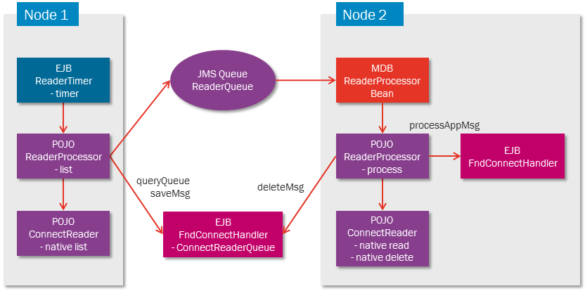 Connector Reader framework architecture is based on EJB Timers and JMS messaging. Each Connector Reader instance, i.e. an instance configured in Setup IFS Connect window in Solution Manager, will correspond to a single timer. The Middleware Server chooses then the node to execute the reader on and has a capability to move the reader (timer) to another node, if necessary. There will be always only one instance of a particular reader (EJB timer) in the entire cluster. It will guarantee failover and scalability. Connector Reader framework, which is a part of IFS Connect framework, is deployed to the Integration cluster.