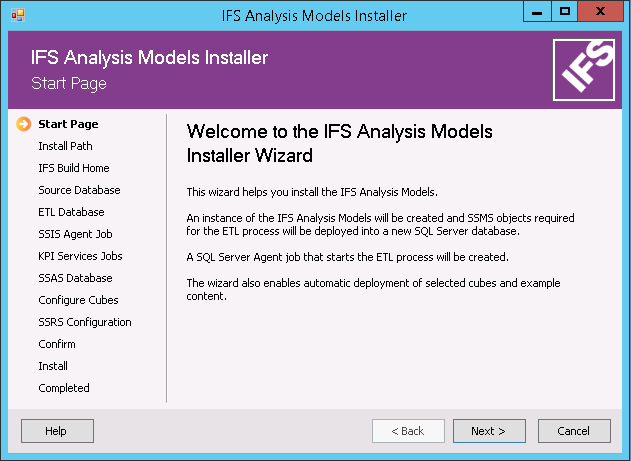To support an easy setup of the data warehouse part of IFS Analysis Models, there is a specific IFS Analysis Model Installer, running on SQL Server that acts as a host for the installation. The following is performed: