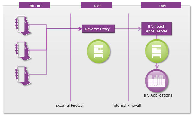 IFS Touch Apps Server acts as an application server and should be protected as such. The server hosting the IFS Touch Apps Server should not be directly accessible from the internet and, if client access is to be allowed from the internet, IFS recommend the use of a reverse proxy in the DMZ. As always best practice standards should be adhered to to protect the service.