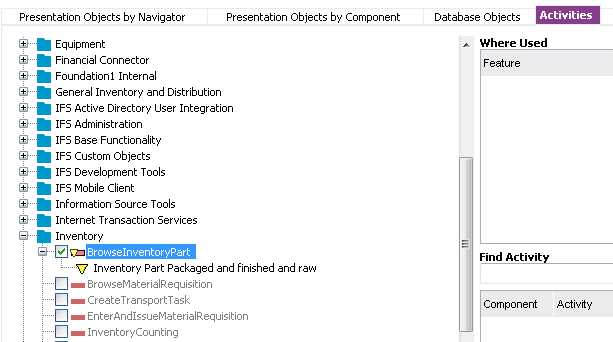 This tab page shows the Presentation Objects arranged by a specific IFS Application Navigator. By default you will see the IFS Enterprise Explorer Navigator.