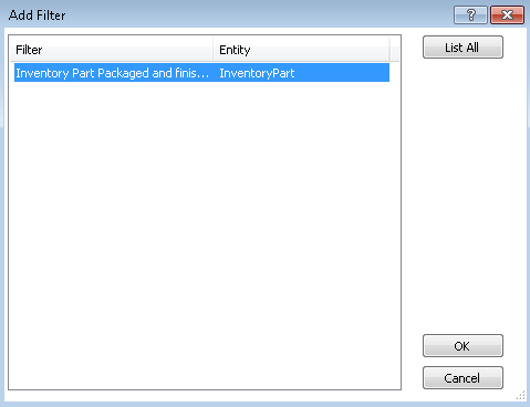 To add a filter right click on the granted activity and select the Add Filter... menu option. This opens up the Add Filter dialog. You can search for existing filters, you will see both the filter name and which entity it applies for. Search for % to find all filters. To select a filter double click on the filter or use the OK button.