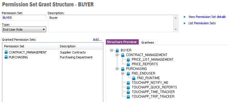 Permission Sets which are added to the Granted Permission Sets list in the form are granted to this Permission Set. If any of these Permission Sets also are granted other Permission Sets you can view the complete grant structure by expanding the tree in the Structure Preview tab to the left.