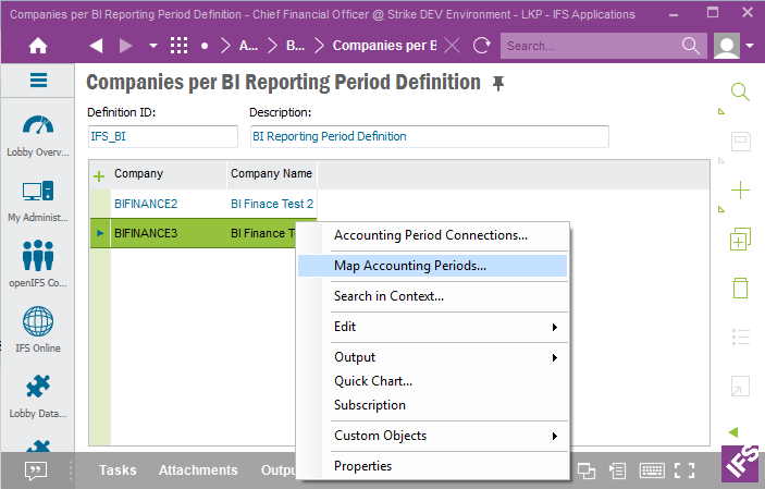 It is in the ETL process necessary to define the Reporting Period Definition ID to be used by each product area. In IFS Applications this means setting up the Company Reporting Period information that should apply for each and every company to be analyzed.