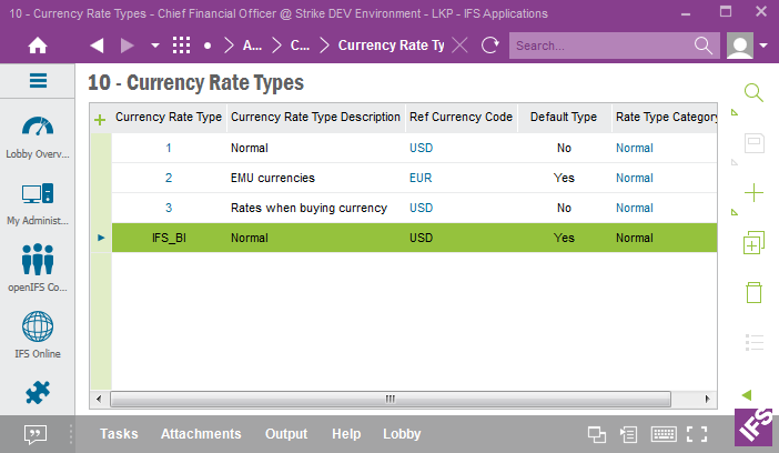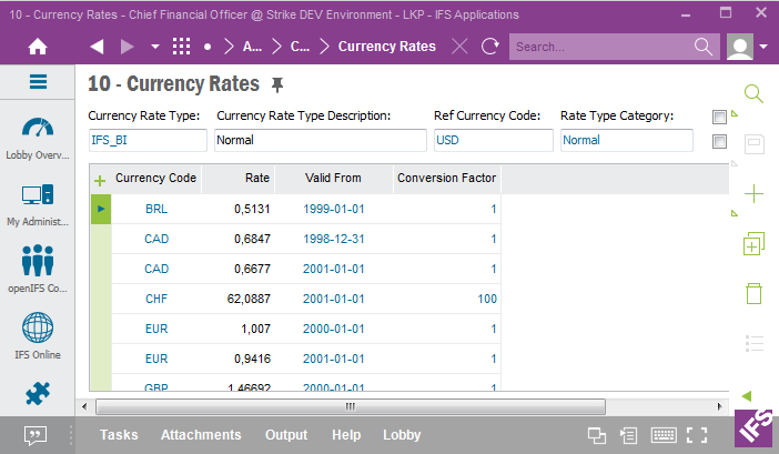 Details, i.e. rates per currency, are defined in the Currency Rates form in IFS EE.