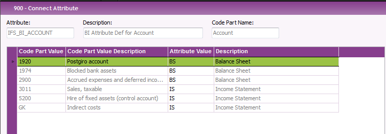 In the above example an attribute with identity IFS_BI_ACCOUNT has been defined for Account. The attribute has two attribute values, BS and IS, representing Balance Sheet and Income Statement accounts. For each attribute value the appropriate accounts are connected.