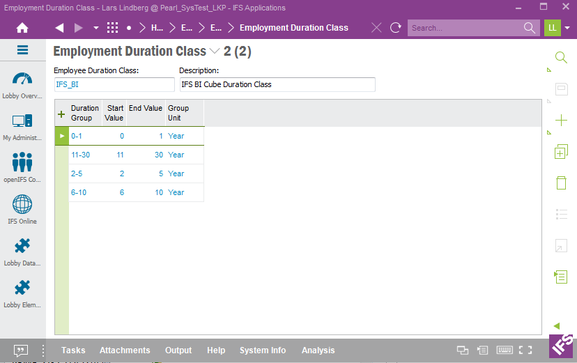 Use the IFS EE form Employment Duration Class to define the necessary data.