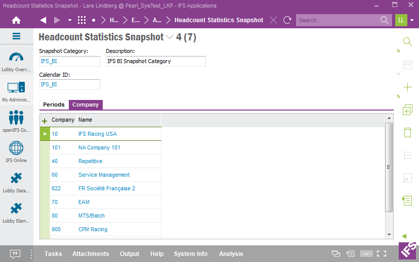 A Headcount Snapshot is created by using the form Headcount Statistics Snapshot form in IFS EE. Each category references one period calendar. Make sure to connect the companies to part of the snapshot before creating. Next the snapshots are created in the Periods tab.