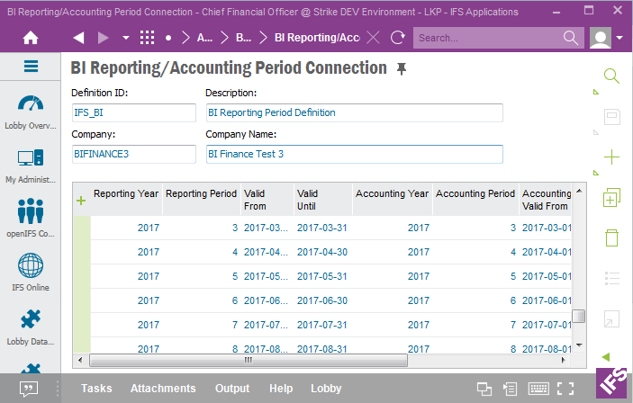 Define the reporting period details, dates per year and period, for each Reporting Period Definition ID. This is done in the BI Reporting Periods form in IFS EE.