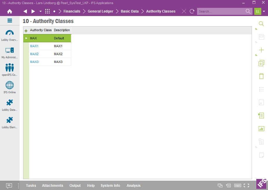 In the Authority Classes form, all available authorization classes in a company can be views. It is necessary to have one authority class that is dedicated for full read access. By default this class is named MAX and it is created when a company is created.