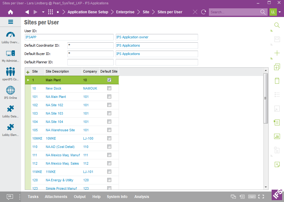 The other possibility is to use the Sites per User form in the IFS EE client.