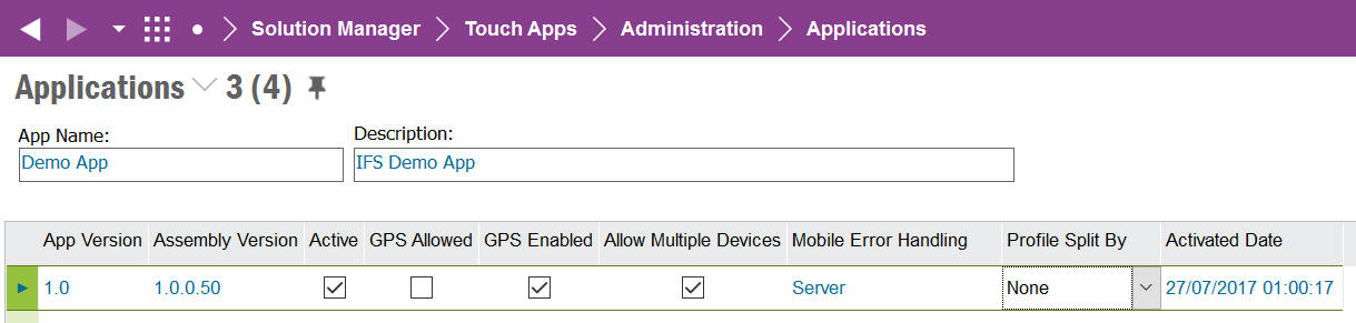 The Application Version displays in the format {Major}.{Minor} and only one version within each major version can be Active at any given time. This is handled via the Touch Apps Server console and is displayed here for information purposes only (more details on IFS Touch Apps (TAS) and Cloud Resources can be found here).