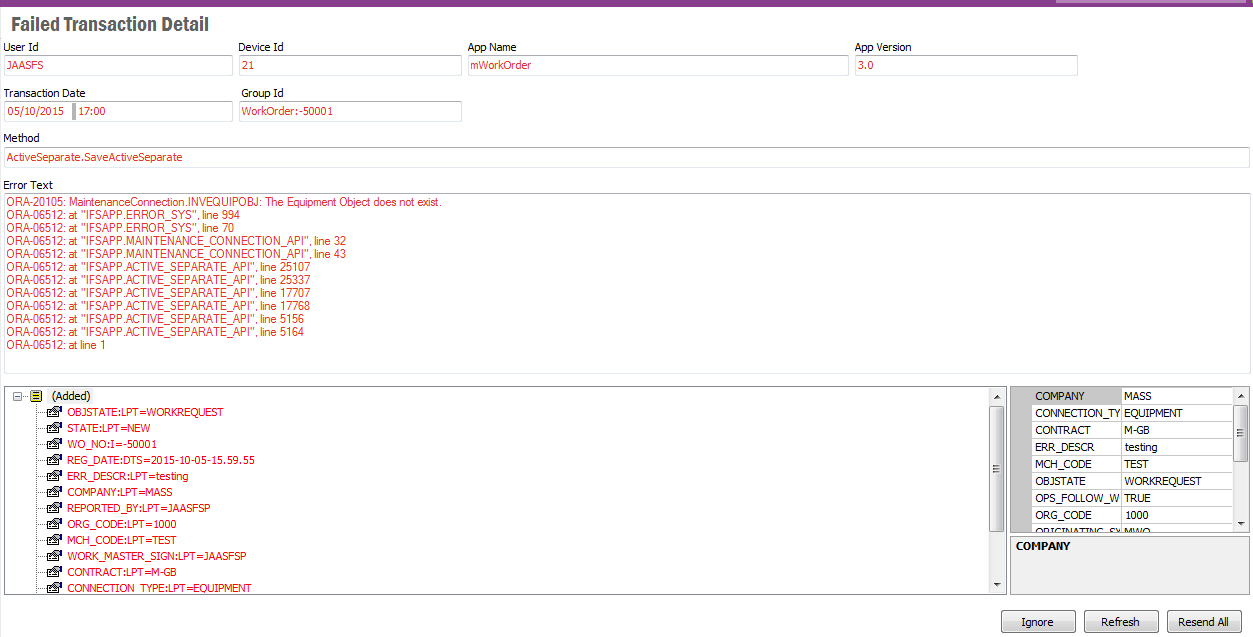 Note that in the above Failed Transaction example the Transaction Group has a negative number. This is due to the mobile application setting a key sequence number with a negative number which will be replaced with an IFS Applications generated sequence number on successfully processing. The IFS Mobile Client Framework ensures the automatic replacement of mobile application generated keys with IFS Applications generated keys.