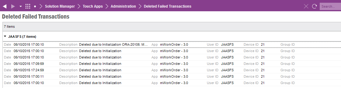 If Failed Transactions exist and the mobile user performs an Initialize to refresh the mobile application data then the Failed Transactions will be automatically deleted.
