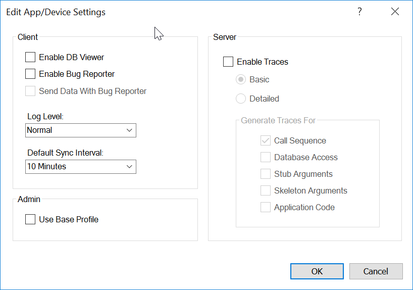 The Edit App/Device Settings allows for the configuring of the client, server and admin settings.