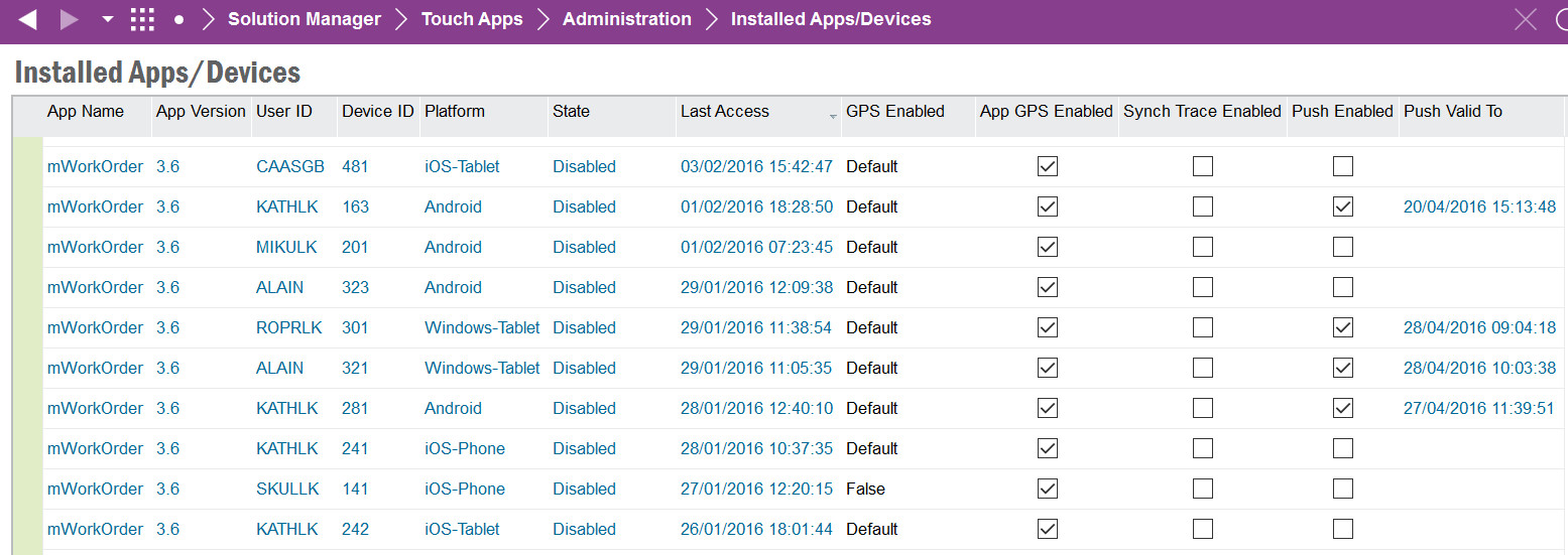 The Installed Apps/Devices screen displays all mobile applications that have been installed per user/device in IFS Applications.