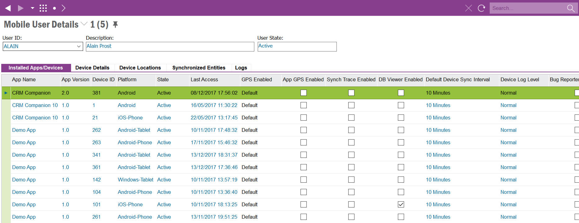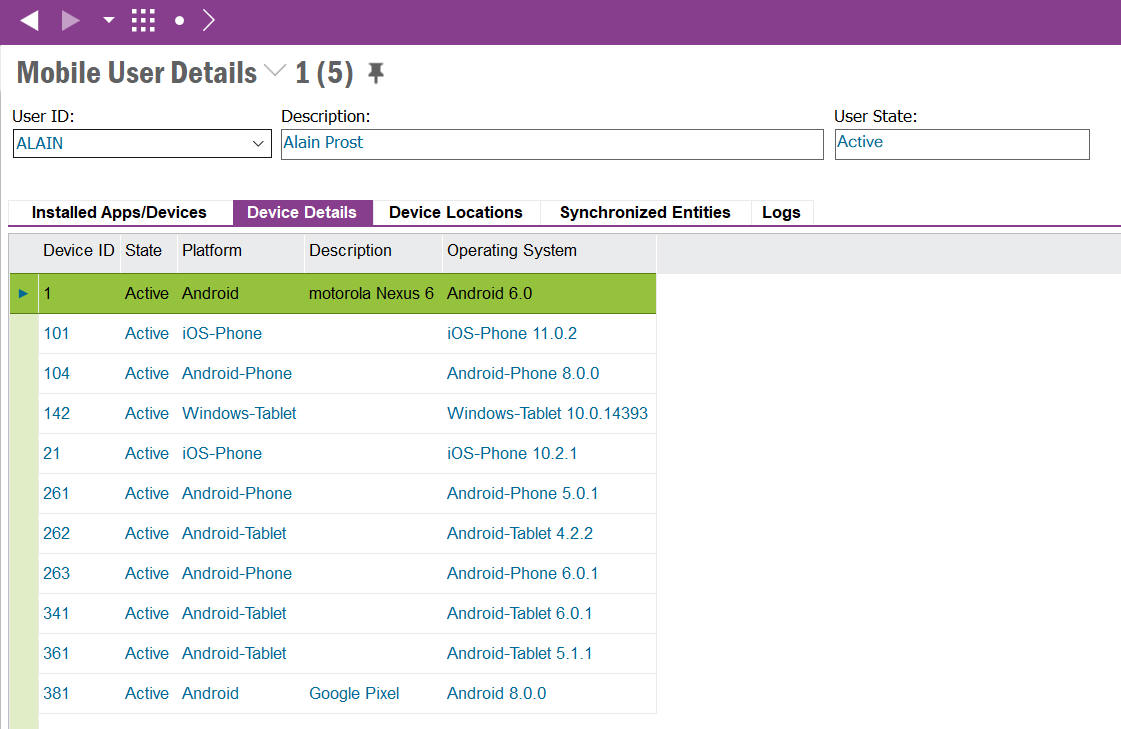 Device Devices show all mobile applications that have been used on all devices that the mobile user has connected to IFS Apps with.