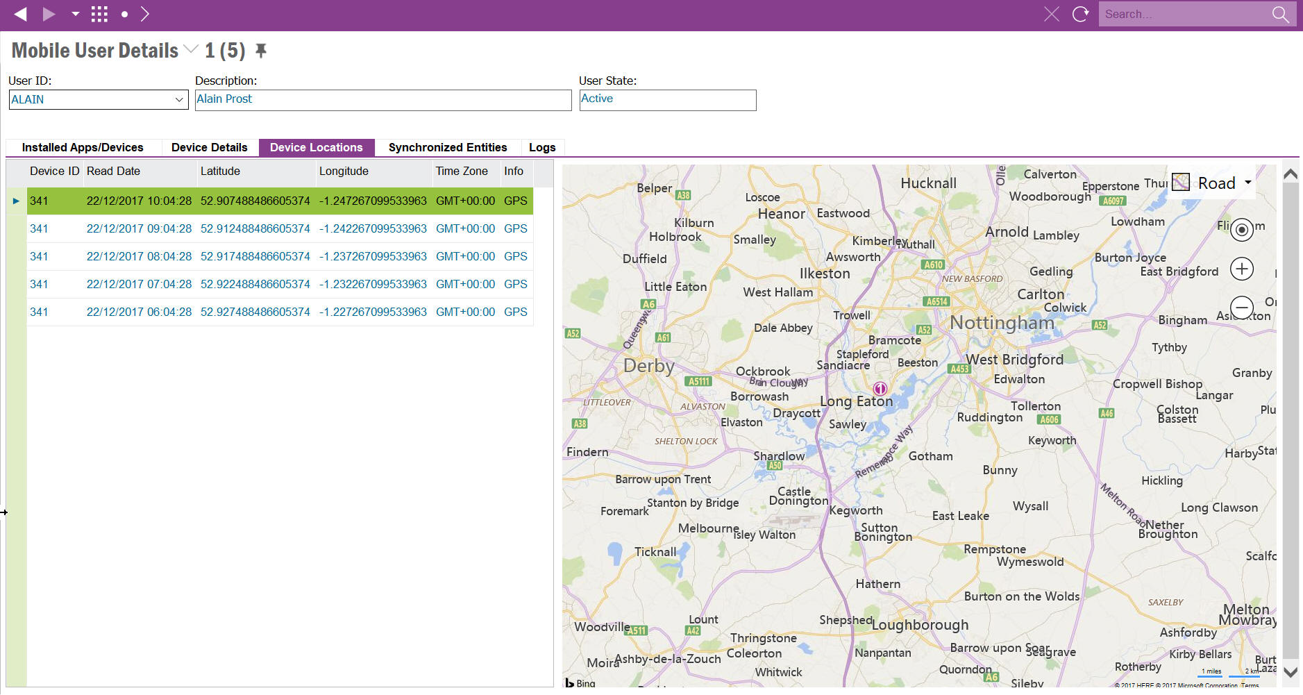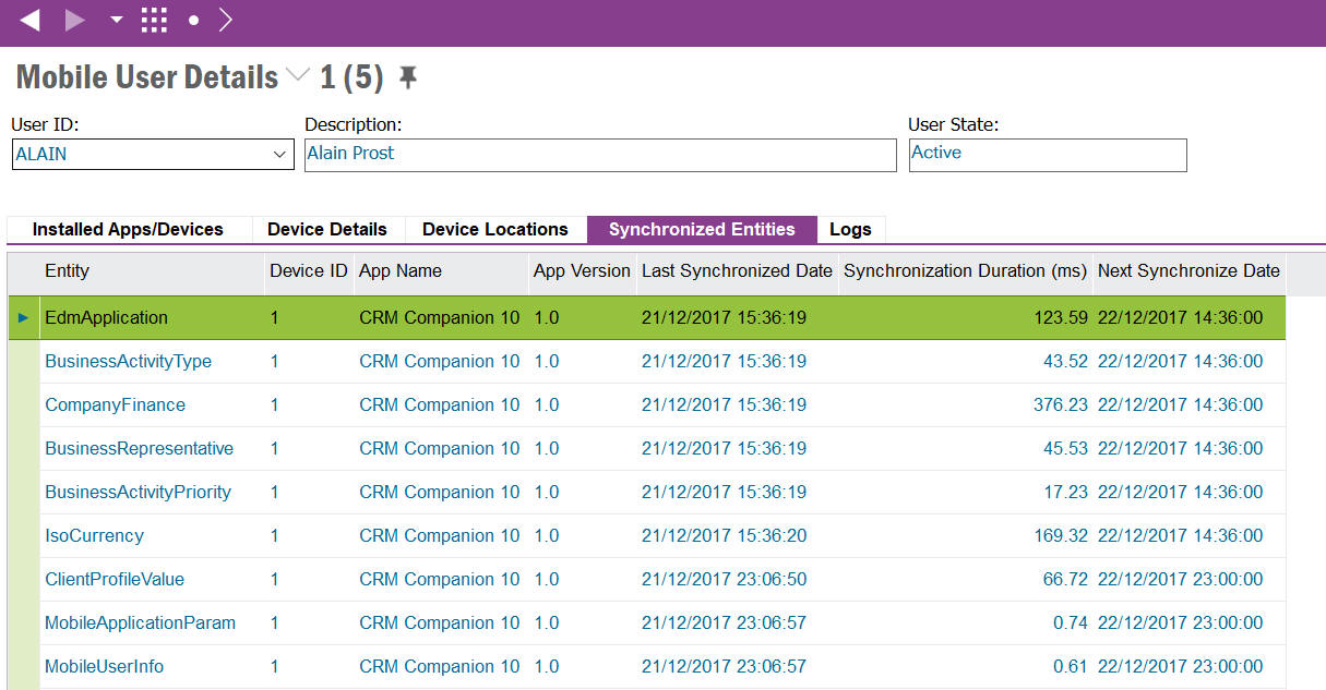 Use the Mobile User Detail screens to browse and manage mobile users including Apps/Devices and viewing Device Details, Device Locations, Logs and Synchronized Entities.