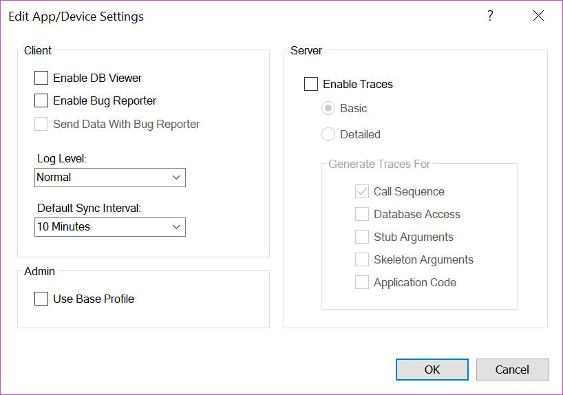 The Edit App/Device Settings allows for the configuring of the client, server and admin settings.