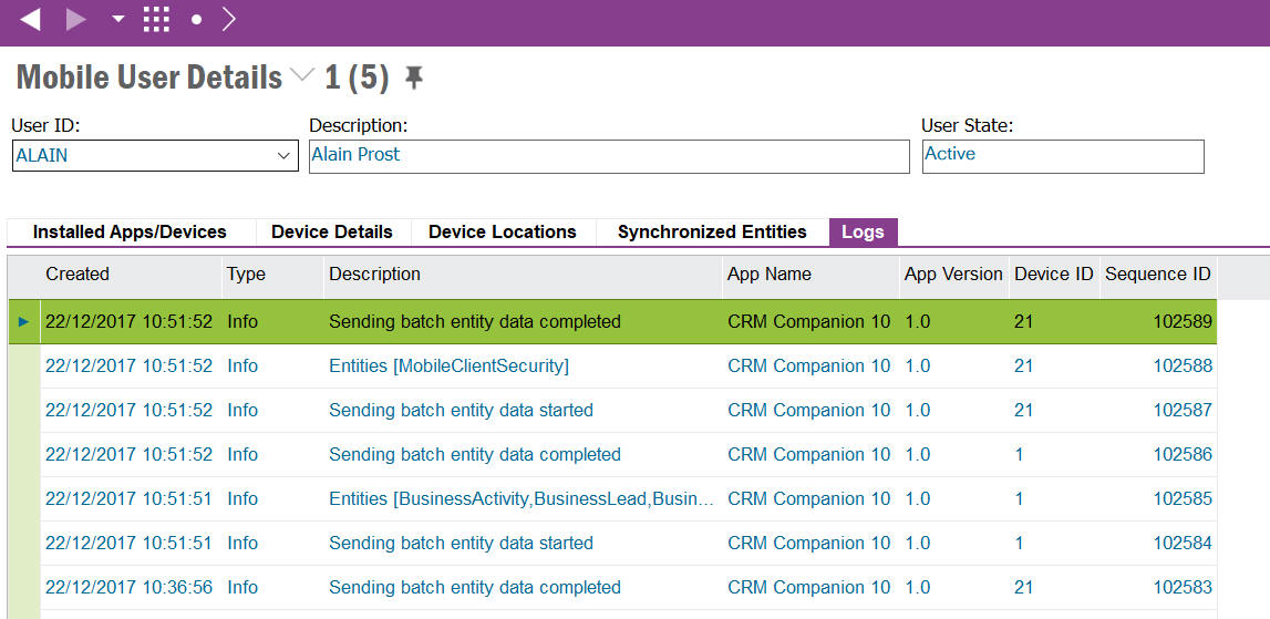 Each time a synchronization event occurs for a User/Device/Application a log record is created.