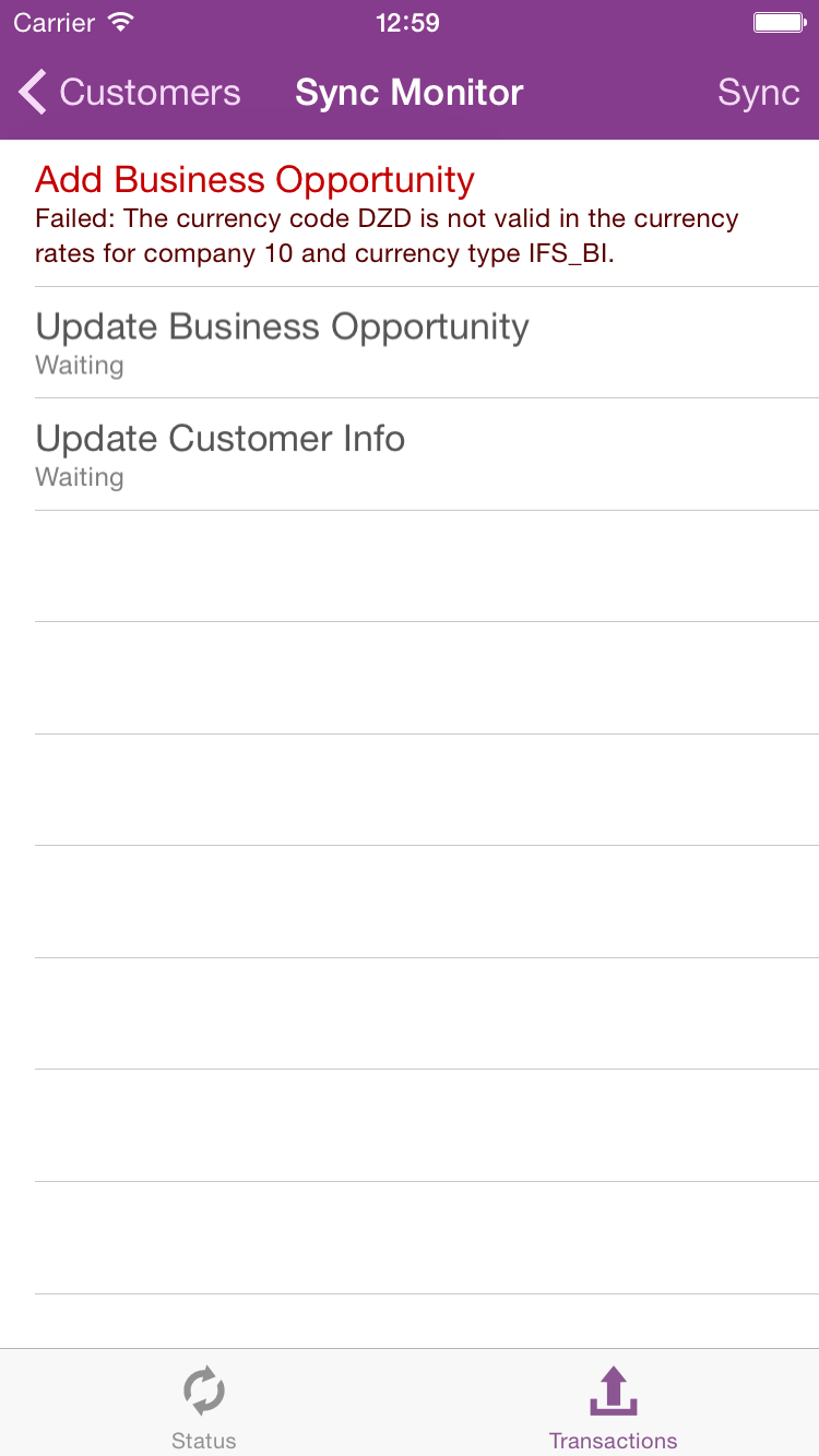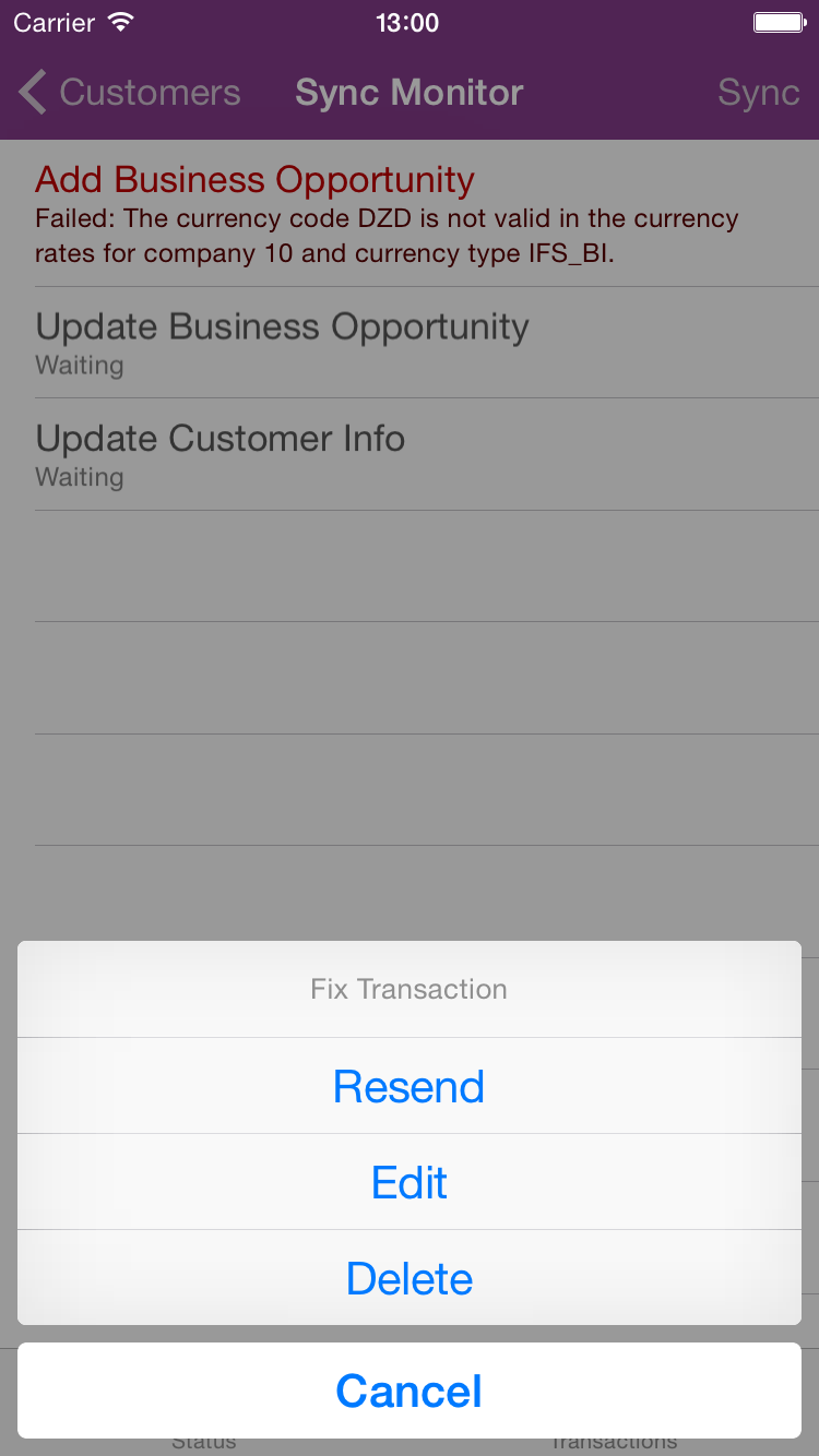 Note: if client errors are not handled then no transactions will synchronize with IFS Applications so it is important that the mobile user deals with errors in a timely manner.