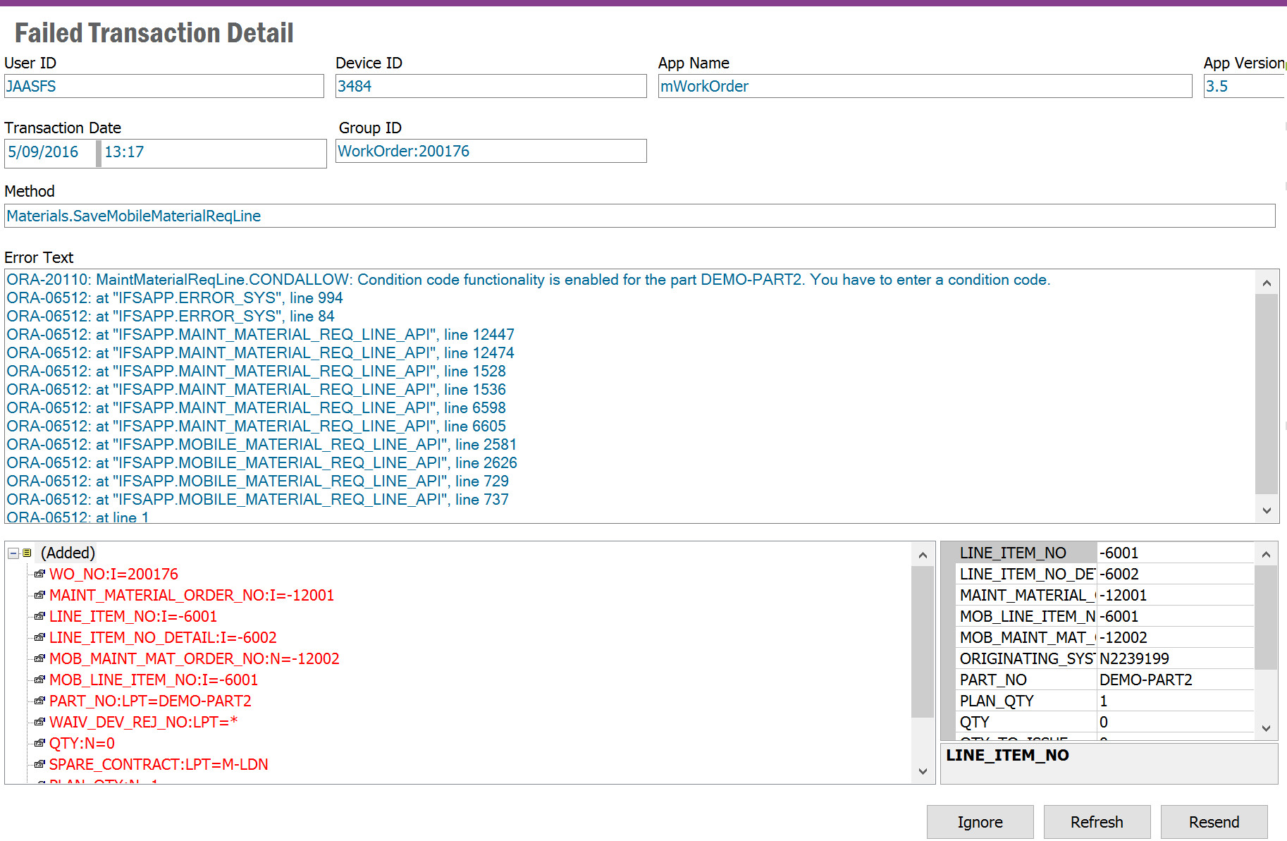 An example changing data can be seen by altering the configuration of a part in IFS Applications that the mobile application has no knowledge of. So a Part that is not configured as Condition Code Enabled is synchronized with the mobile application. After this point if the part configuration is changed to enabled Condition Code will result in the following Failed Transaction if the part is used in the mobile application before the part basic data is updated: