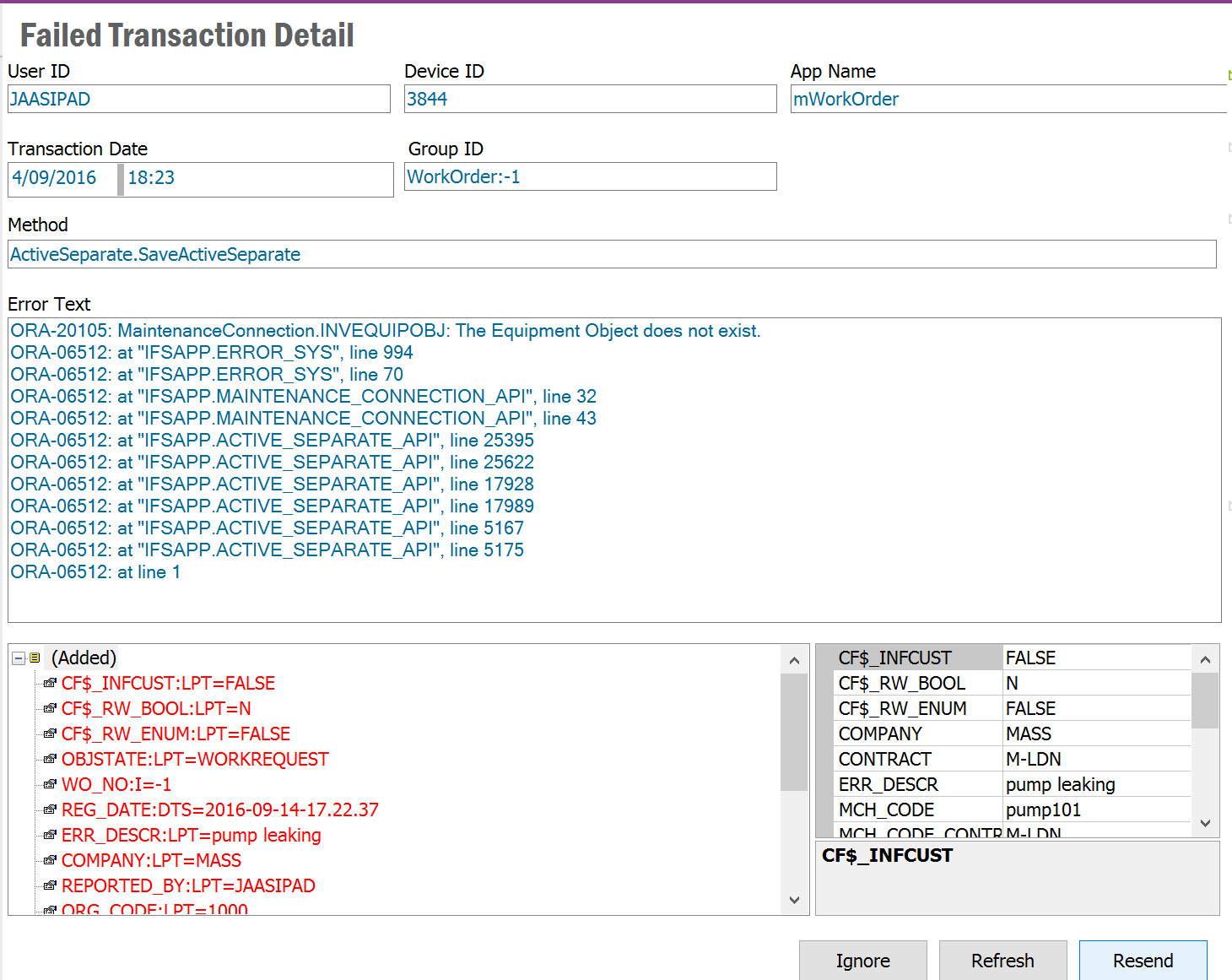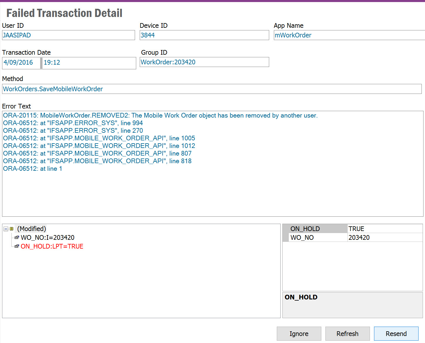 An example of a consequential error is the creation of a Work Order followed by changing the Work Order status. On deleting the Work Order transaction then the subsequent state change transaction will fail as the Work Order will not exist in IFS Applications and will generate a Failed Transaction as: