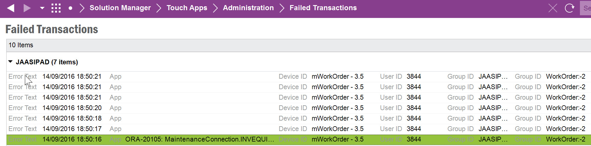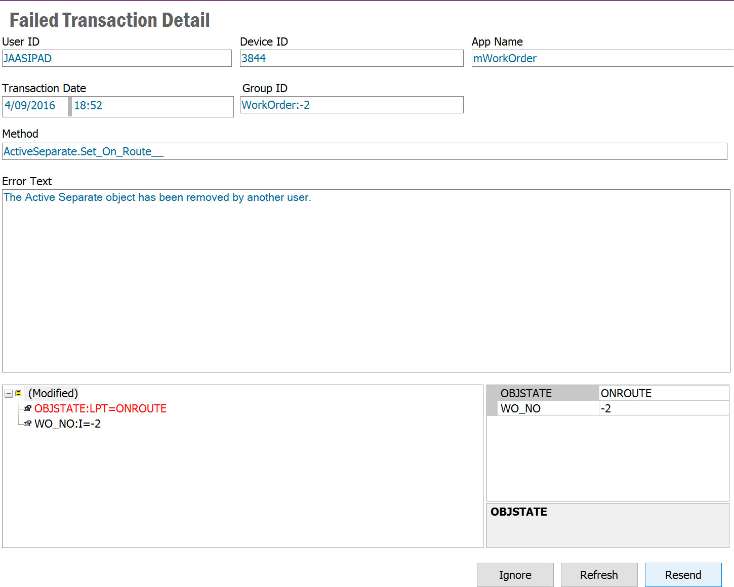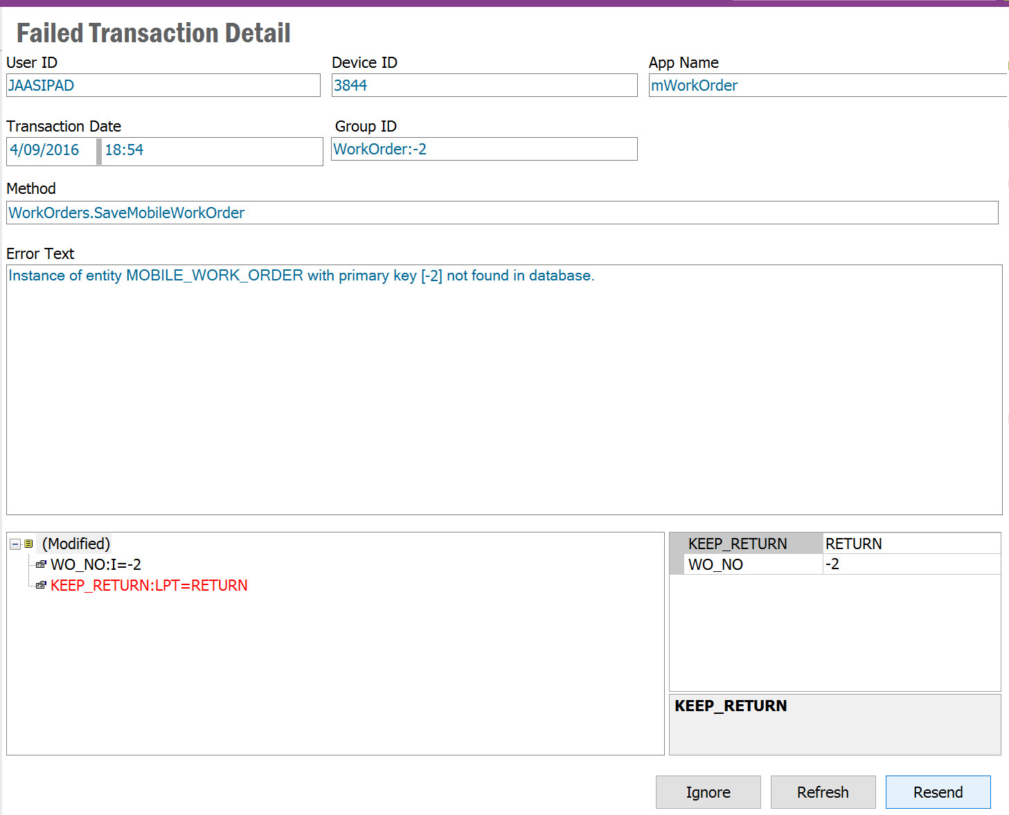In this example, if the mobile user continues to update the Work Order then it is likely that the following Failed Transaction will be generated: