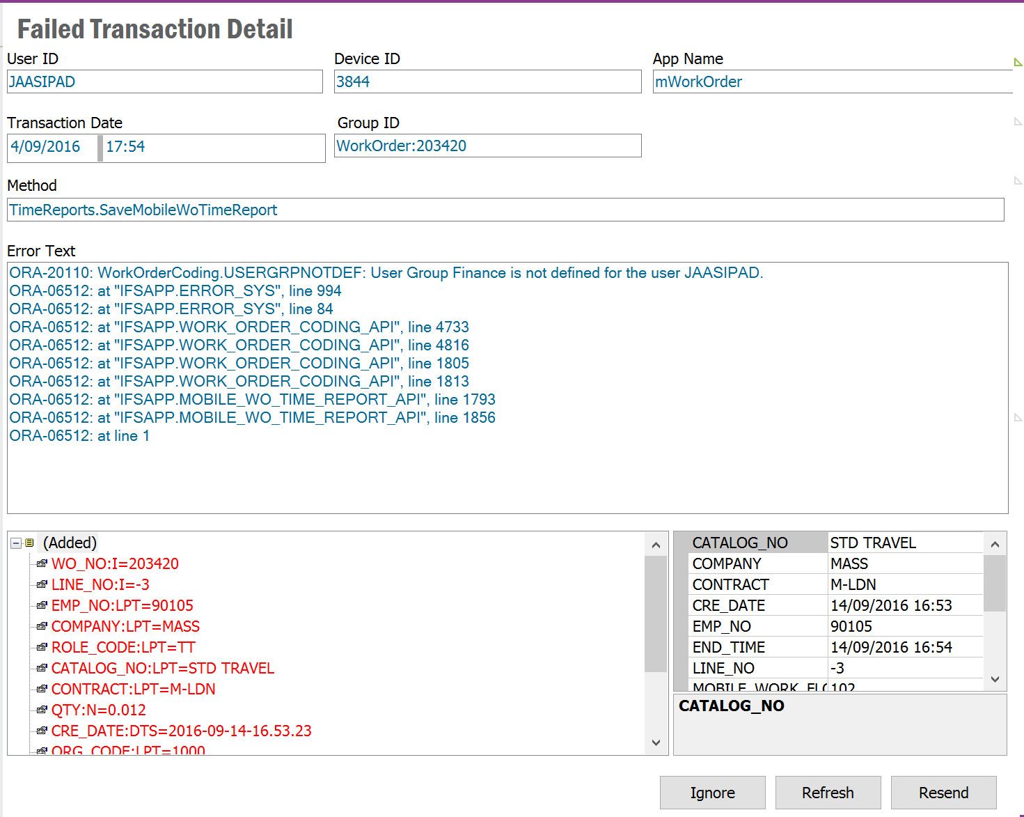An example of incorrect mobile user data set-up is when the user is not defined against an Accounting Rules User Group. In this example when a mobile application sends a transaction that will create a financial transaction in IFS Applications the following Failed Transaction will be generated: