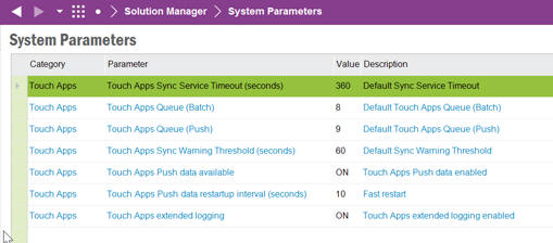 Touch Apps Sync Service Timeout: This parameter sets the Mobile Synchronization Timeout for the database to wait for a response from the Extended Server.